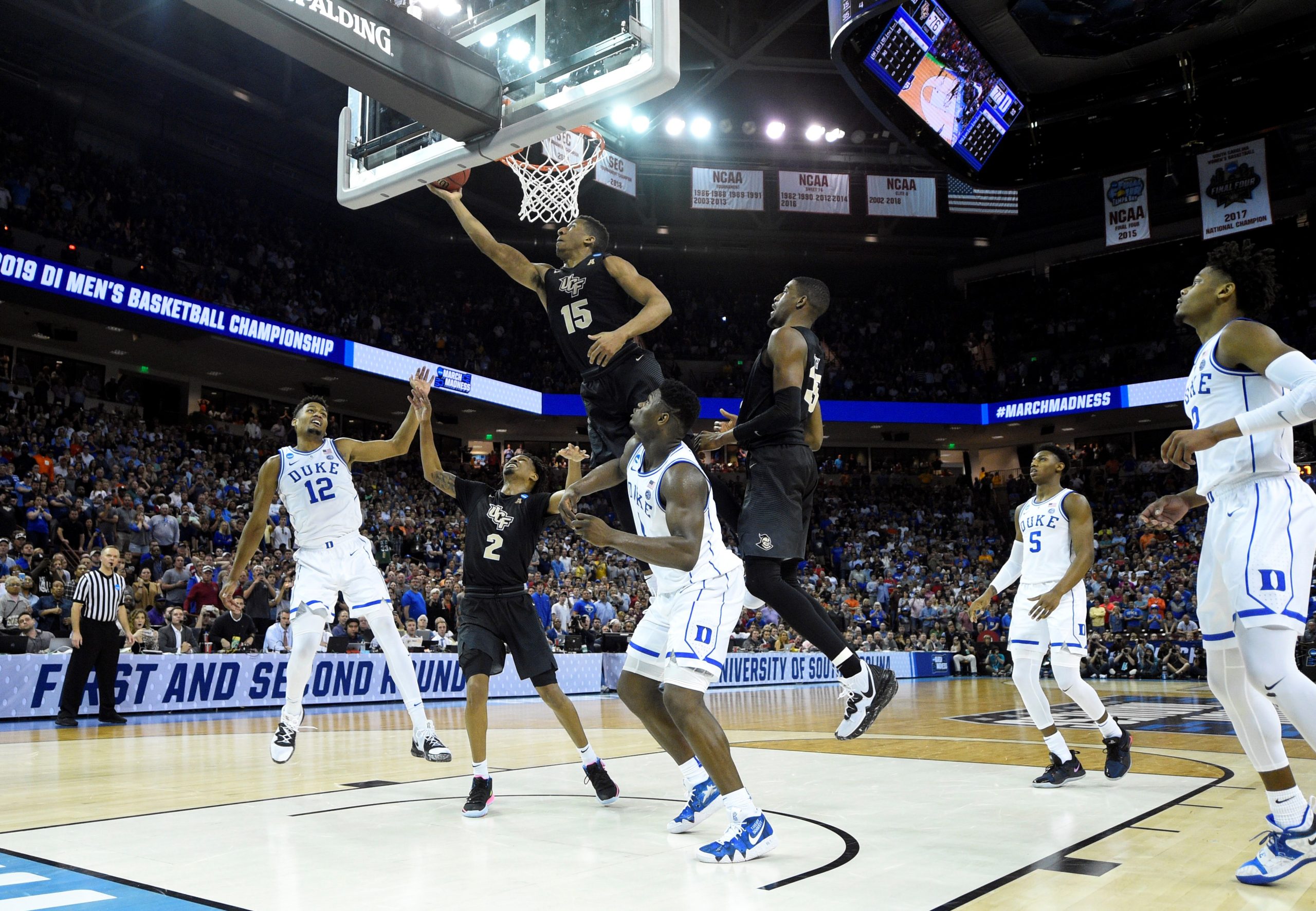 Duke trailed by one point with 11 seconds remaining when Williamson drove to the basket where the Knight’s 7-6 center Tacko Falls was waiting. Williamson made a spectacular play and made the shot and was fouled on the play. He had a chance to tie the game at 76-all but missed the free throw and Barrett got the offensive rebound and scored on the put-back basket to give the Blue Devils a 77-76 lead with 8.2 seconds remaining. UCF had two chances to win on a drive to the basket by B.J. Taylor, and a tip in attempt by Aubrey Dawkins, but neither shot would stay down.