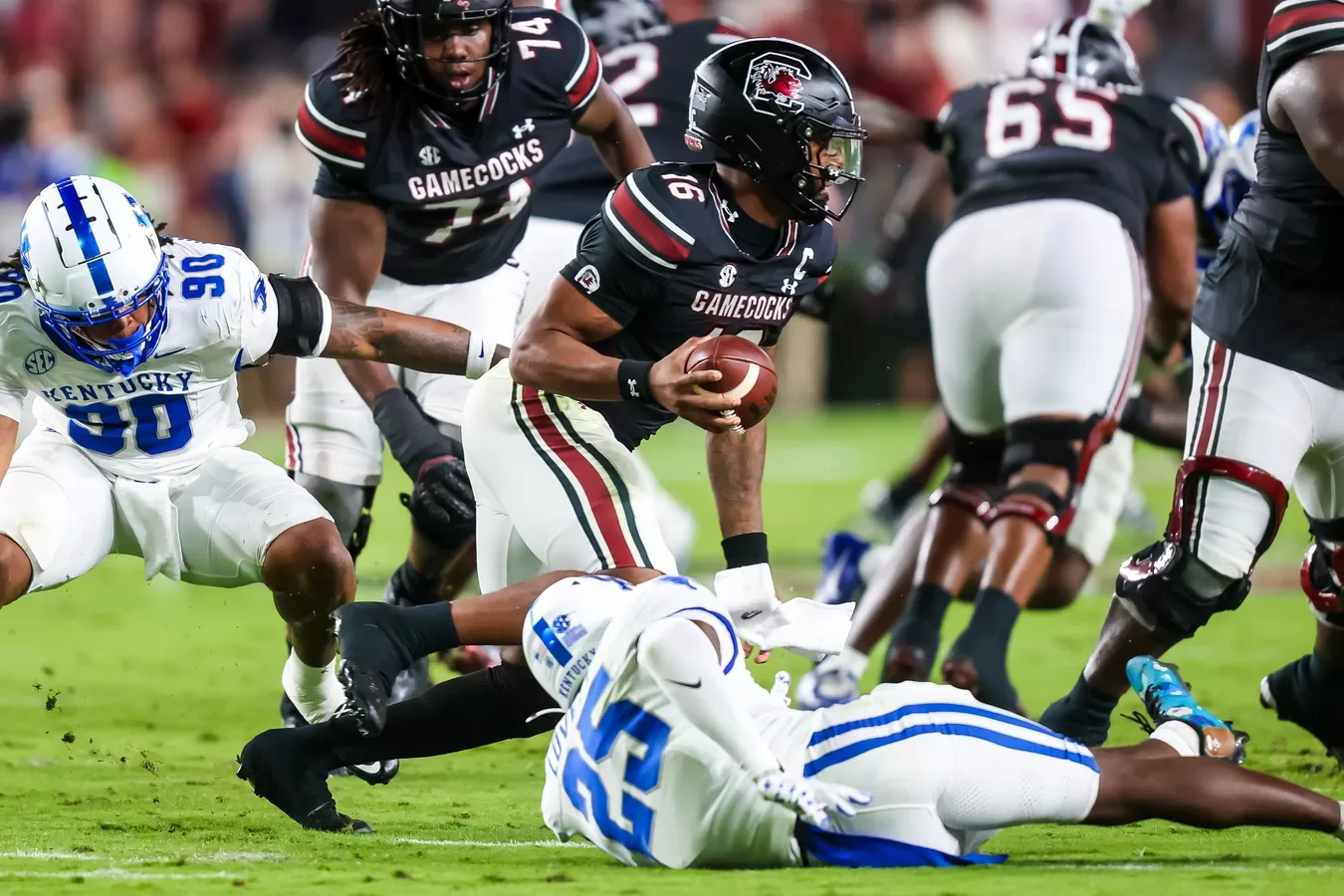 On the Gamecocks’ first possession, Sellers drove his team 75 yards on 12 plays with Rahsul Fasion tying the score on a 12-yard touchdown run. Kentucky added a field goal to lead 10-7 at the end of the first quarter. The Wildcats had 146 yards of total offense in the opening period.