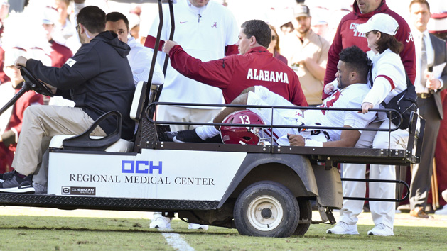 Before the injury, Tagovailoa was 14-of-18 passing for 256 yards with two touchdowns. He entered the game second nationally in passing efficiency with a rating of 204.9.